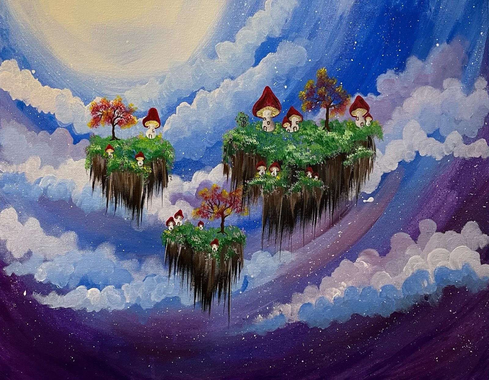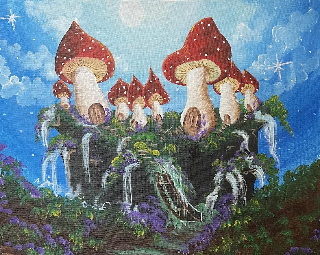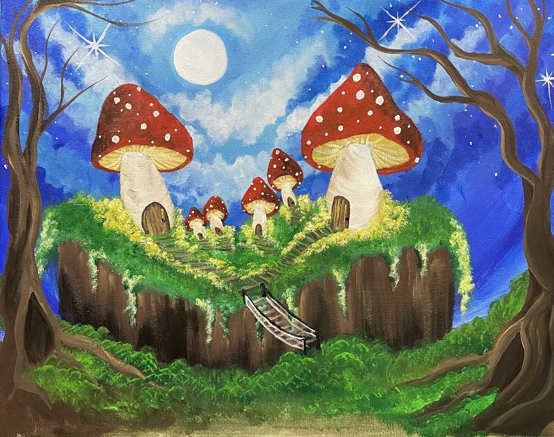 Mushroom houses surrounded by lush vegetation and lots of trees. There may be an item there that you seek. These pictures are a series of mushrooms and magical spaees that I want to be in.